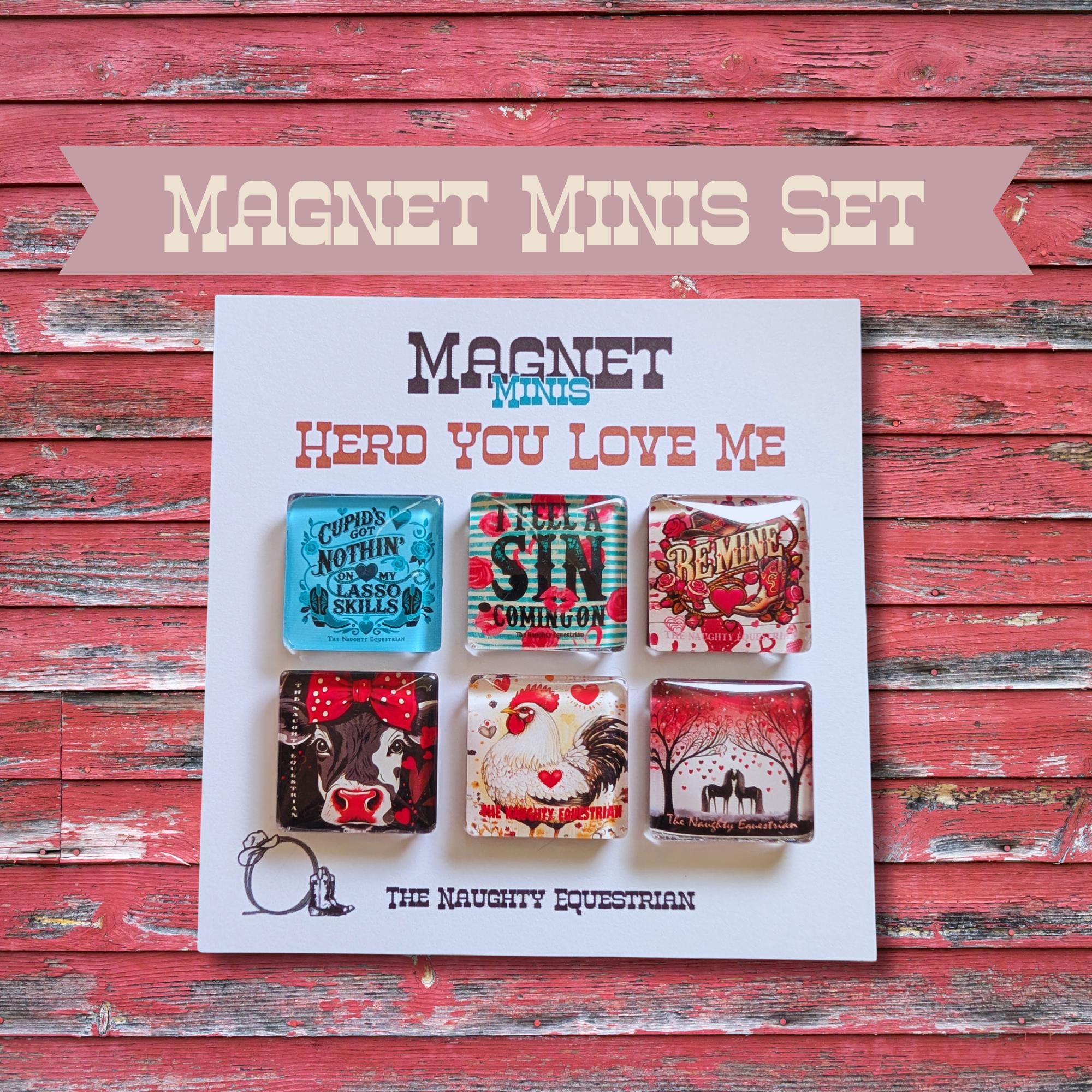 With playful designs like “Cupid’s Got Nothin’ on My Lasso Skills” and “I Feel a Sin Coming On,” this set blends sweet sentiments with a cheeky twist. Perfect for your fridge, locker, or as a unique gift for the animal lover in your life, these magnets bring the love with a country flair.