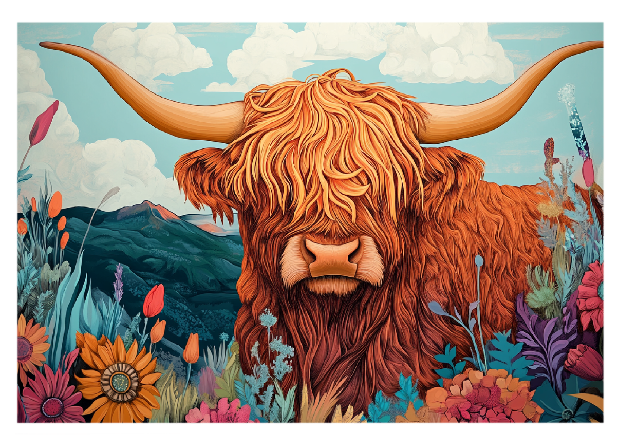 Bring a smile to someone’s day with this charming Highland cow greeting card, featuring a fluffy, long-haired cow framed by vibrant wildflowers and rolling hills. With its iconic sweeping horns and warm copper tones, this lovable cow captures the heart and rustic beauty of the countryside—equal parts cozy, cheerful, and artistic.